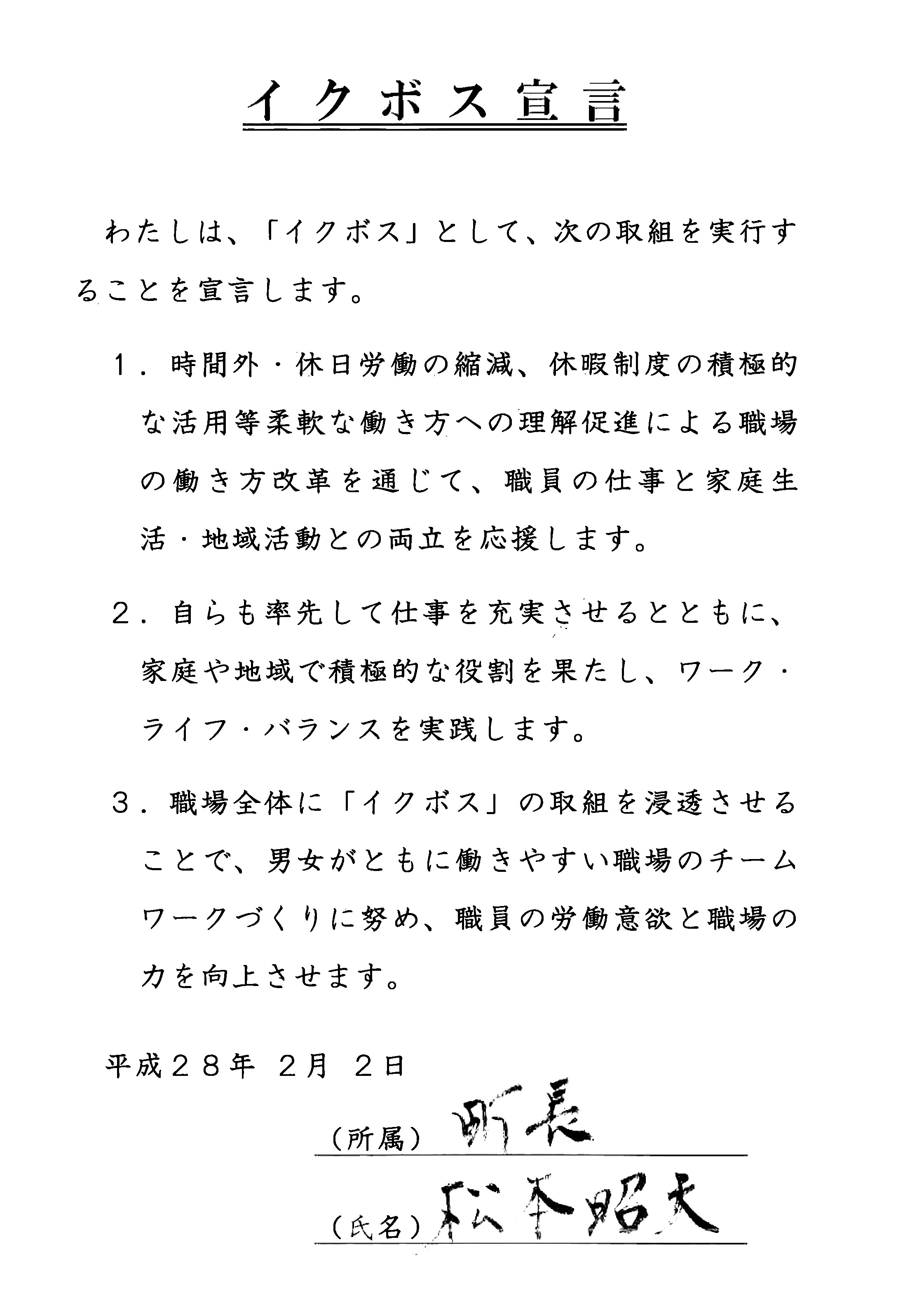 イクボス宣言 【イクボス宣言】鳥取県北栄町にて町長をはじめ管理職らがイクボス宣言 イクボスドットコム編集部 2017年2月2日 / 2020年3月8日 平成28年2月2日、松本町長をはじめ管理職らがイクボス宣言を行いました。 🔗イクボス・ファミボス宣言(同市公式ページ) 【リンク】 北栄町公式サイト 鳥取のイクボス宣言(自治体・企業団体一覧)