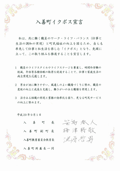 イクボス宣言 【イクボス宣言】富山県入善町にて町長をはじめ、副町長、教育長及び各課長がイクボス宣言 イクボスドットコム編集部 2017年9月1日 / 2020年3月8日 平成29年9月1日、富山県入善町にて、町長をはじめ、副町長、教育長及び各課長がイクボス宣言を行いました。 🔗入善町職員「イクボス宣言」について(入善町公式ページ) 【リンク】 入善町公式サイト 富山のイクボス宣言(自治体・企業団体一覧)